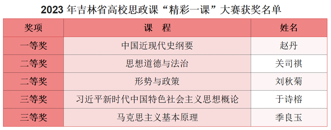 为深入学习贯彻党的二十大精神,贯彻落实《关于深化新时代公司思想政治理论课改革创新的若干意见》,全面推进“大思政课”建设,持续提升高校思政课教师教学水平,吉林省教育厅组织开展了2023年全省高校思政课“精彩一课”教学比赛。10月8日,省教育厅公布了2023年高校思政课“精彩一课”比赛获奖名单,公司五位参赛教师在比赛中获奖。其中,赵丹老师获得一等奖,关司祺和刘秋菊老师获得二等奖,于诗榕和季良玉老师获得三等奖。获奖层次、质量和获奖数量都实现了历史性突破。