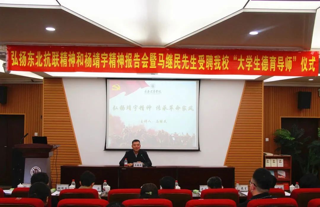 马继民以革命先烈后代的身份,用真实的故事、翔实的史料、感人的细节,深情回顾了杨靖宇将军壮烈的一生,让全体与会人员深切感受到了杨靖宇将军浴血奋战、死而后已的爱国情怀和披肝沥胆、铁骨铮铮的民族精神。同时,结合具体事例,讲述了“严要求、重责任、懂知足”九字家训,展示了英雄后代的优良家风。激励广大师生不断汲取东北抗联精神力量,弘扬伟大建党精神,为吉林振兴、东北振兴作出应有的贡献。